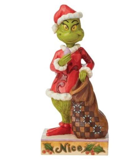 The Grinch is a classic story of a humbug turned holiday hero. Exemplifying both Naughty and Nice, this Jim Shore dual figured effigy shares both sides of the story. One side showing a frowning Grinch stealing ornaments, while the other smiles with love.