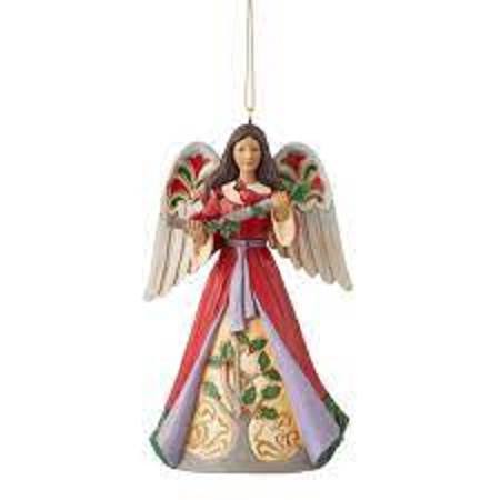 This Jim Shore Angel Ornament features an angel, with wings decorated in poinsettia petals, holding a twig of holly with two cardinals on it. In unmistakable Jim Shore style, details of her dress include red Christmas flowers and green holly leaves.