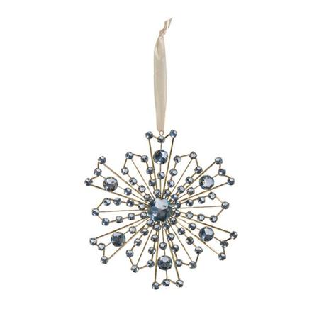 An icy blue jeweled snowflake Christmas ornament with a silver frame will look stunning on a snow themed tree this holiday season! Made by Raz Imports. Made of plastic and metal. Dimensions: 5" L X 0.25" W X 5" H. Item #: 4413519