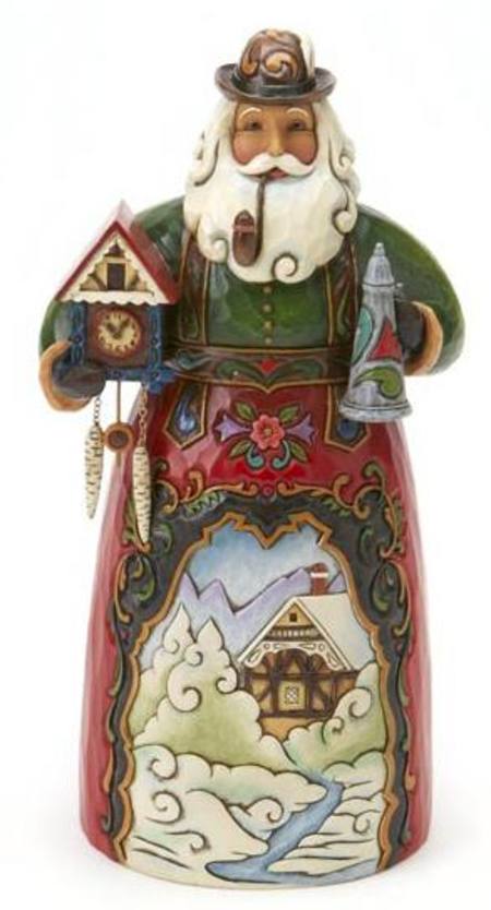 Part of the Santas Around the World collection, Father Christmas travels to the land of Germany. He holds an old clock and a kettle while displaying a quaint scene of the German countryside.