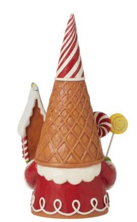 Add some candy to your Christmas with this festive gingerbread gnome from Jim Shore! Wearing a waffle cone hat, he holds peppermint lollipops and a gingerbread house. With sprinkles in his beard, he celebrates the sweetness of the season.
