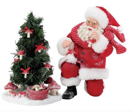 This figure is sure to bring joy this holiday season! Santa is dressed in a cozy red suit with a knitted scarf as he kneels next to a small tree. The tree is decorated with small red and white mushrooms! Underneath the tree sits a few mushroom houses and presents buried in the snow! Santa adds a few more mushroom ornaments before moving on his way!