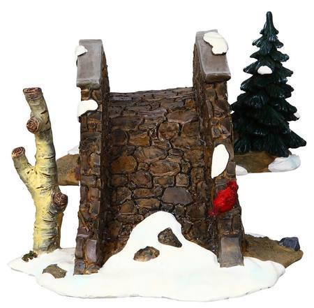 The Olde Stone Bridge is a sturdy bridge with lots of charm. It's a great way to add dimension to your village. Next to the bridge is a tree trunk and a bright red cardinal on one side, with a beautiful coniferous tree on the other side.