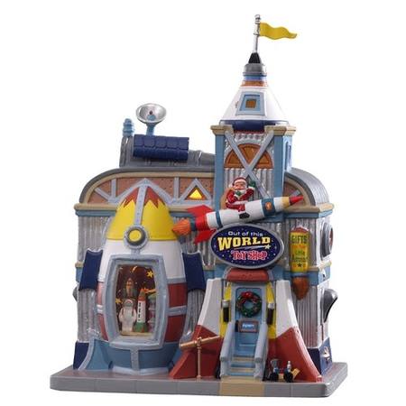 This Out of This World Toy Shop looks like a toy store out of a child's dream. The entire building is made out of spaceship parts, including the lighted front window display that looks like a big rocket. The roof features a satellite dish, a solar panel, and the top of a rocket. On the front of the building, Santa is holding his sack of gifts while riding a rocket. This is definitely the perfect store to find a gift for any little astronaut.