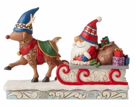 This playful piece by Jim Shore features a jolly batch of gnomes in route to your holiday home. Lead by a dashing reindeer with gnome-like characteristics, three colorful winter-clad gnomes enjoy a sleigh ride on a snowy day.