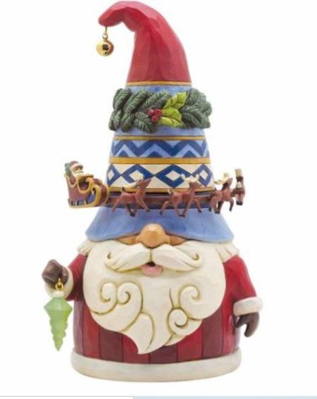 No one knows gnomes like Jim Shore! This holiday gnome is dressed as Santa with an ornament in hand and a towering hat fitted with a jingle bell. A rotatable scene of Santa and his reindeer turn on this gnome's hat. Celebrate the season in style.