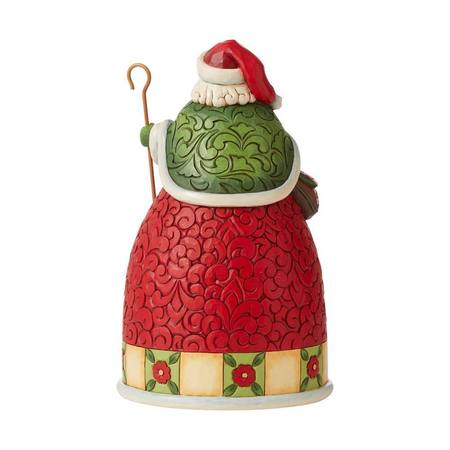 This Jim Shore Santa figurine commemorates the twelve days of Christmas in a colorful design. Santa holds a shepherd's hook and satchel while his robes reveal an intricate ensemble of birds, pipers, and dancers, each of the twelve days represented.