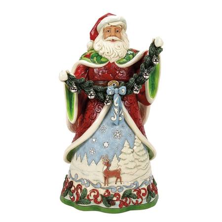 This 3rd annual collector's edition Santa by Jim Shore is a masterpiece. Holding an evergreen garland embellished with silver bells and bows, Santa reflects on nature with a winter tree and deer scene. A beautiful deluxe piece for your holiday home decor.