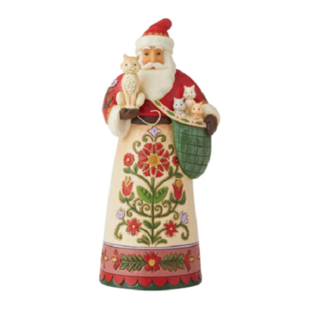 This spectacularly dressed Jim Shore Santa carries a cluster of Christmas cats in his bag. With a floral cloak and holly brimmed bag, Santa delivers gifts that keep on giving-and meowing! These festive feline surprises can't wait to join your family.