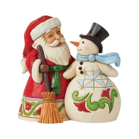 This pint sized Jim Shore Santa greets a snowman friend this holiday season. Standing five inches tall this affectionate figurine celebrates winter festivities and friendship. Smiling together the pair remind us Christmas is for togetherness.