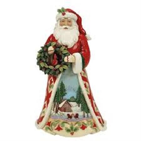 Christmas at the Lodge by Jim Shore designed a Santa holding a festive wreath, ready to spread holiday cheer. His intricately decorated cloak, patterned with red flowers, parts to reveal a winter lodge scene, complete with mountains and Adirondack chairs