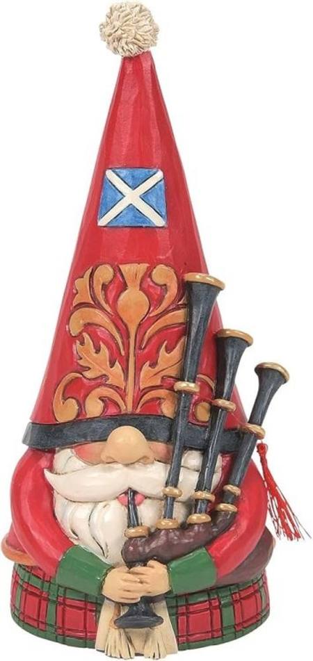 im Shore's Gnomes Around the World collection is a whimsical celebration of symbols and customs from nations near and far. The Scottish Gnome sports a traditional kilt and regal rosemaling hat with the flag of Scotland as he plays the bagpipes.