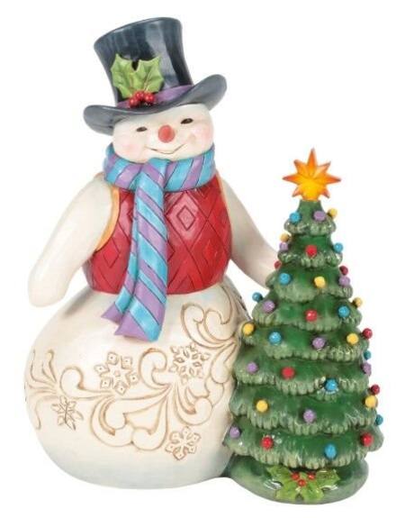 This enchanting Jim Shore snowman, dressed in a gorgeous tunic, scarf, and holly-brimmed top hat, stands beside a decorated Christmas tree and the star lights up. Adorned with snowflakes and rosemaling, he brings a vintage warmth to your holiday home.