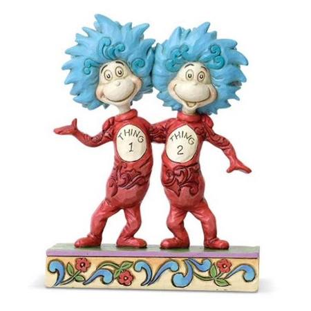 Brand New Jim Shore Dr. Seuss Thing 1 and Thing 2 FigurineThing 1 and Thing 2, the mischievous pair from the classic children’s tale, Cat in the Hat, stand cheerful on the edge of chaos in this fun-filled design from the imagination of Dr. Seuss and the artistry of Jim Shore.
